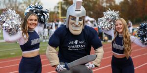 Haley Pouliezos, senior libero from Imperial, Mo., saves the Spartans from losing a point as the crowd looks on anxiously.