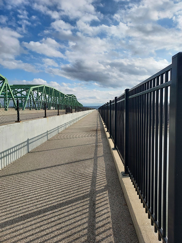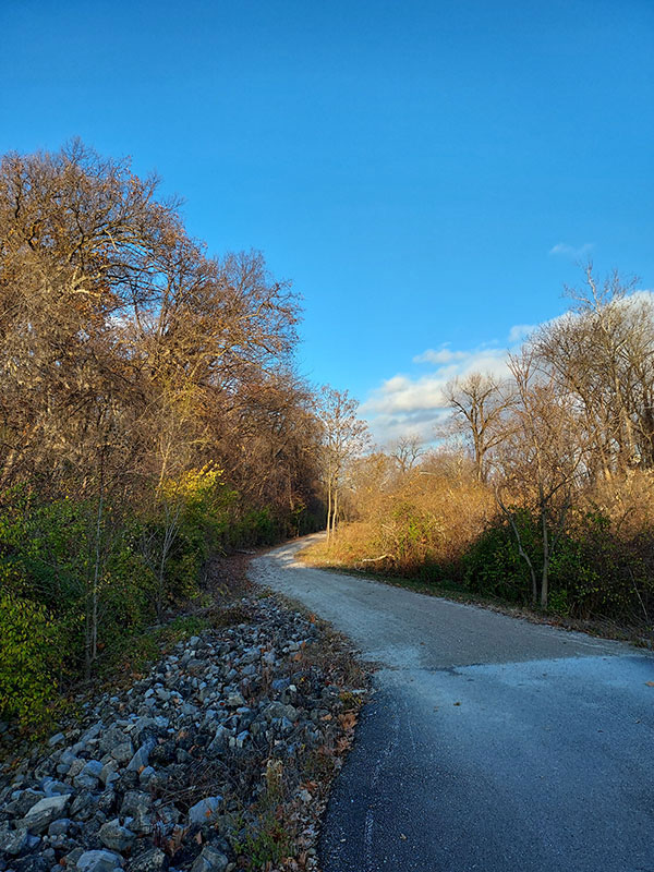 There is a trail behind the Premium Outlets in Chesterfield that feeds into the Katy Trail. To get from the shops to the Katy, however, you have to run along a sidewalk on the edge of a bridge. With a tall, black metal fence on one side and a concrete barrier on the other, this 0.5-mile stretch can be very loud as the vehicles zooming past on your side create wind and whining tires and honking horns. When the sun is shining through the metal bars of the fence, it casts hundreds of lines of shadows, which make it feel like you are constantly blinking.
